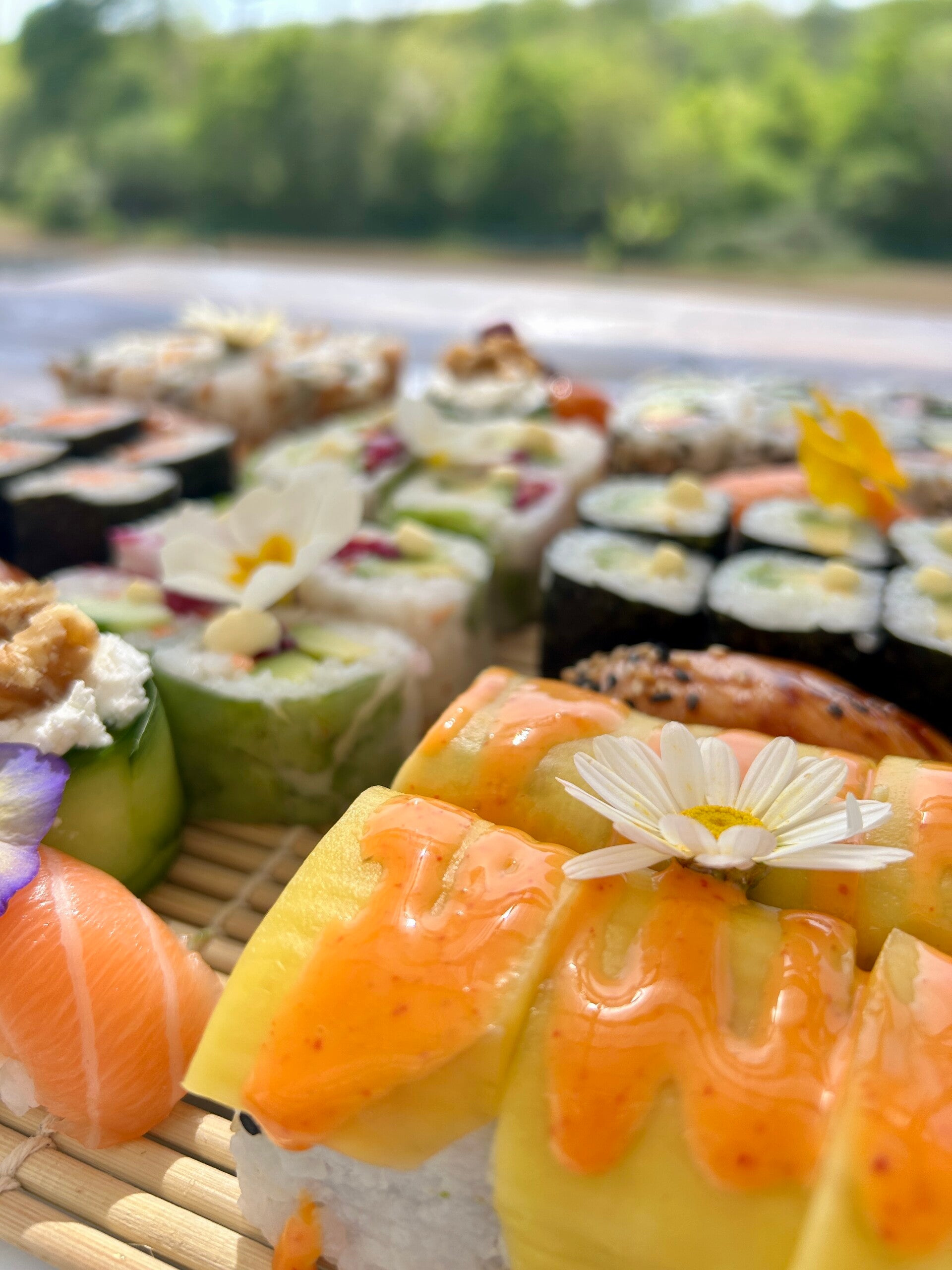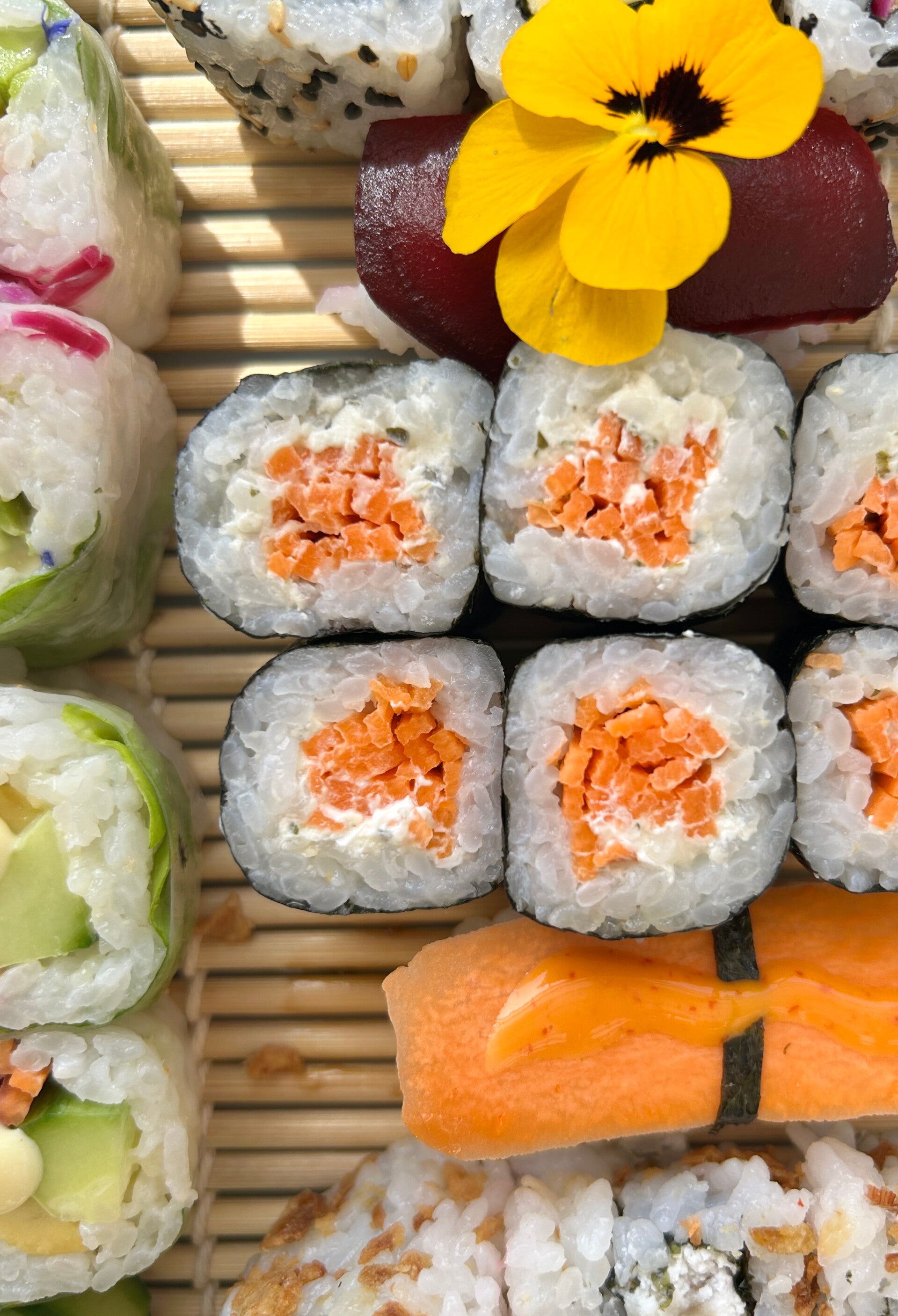 Du saumon fondant, du cream cheese ail & fines herbes, de la crevette tempura mangue crousti-fondante... et l'association chèvre miel & noix qui est un classique revisité dont on se le lasse pas .